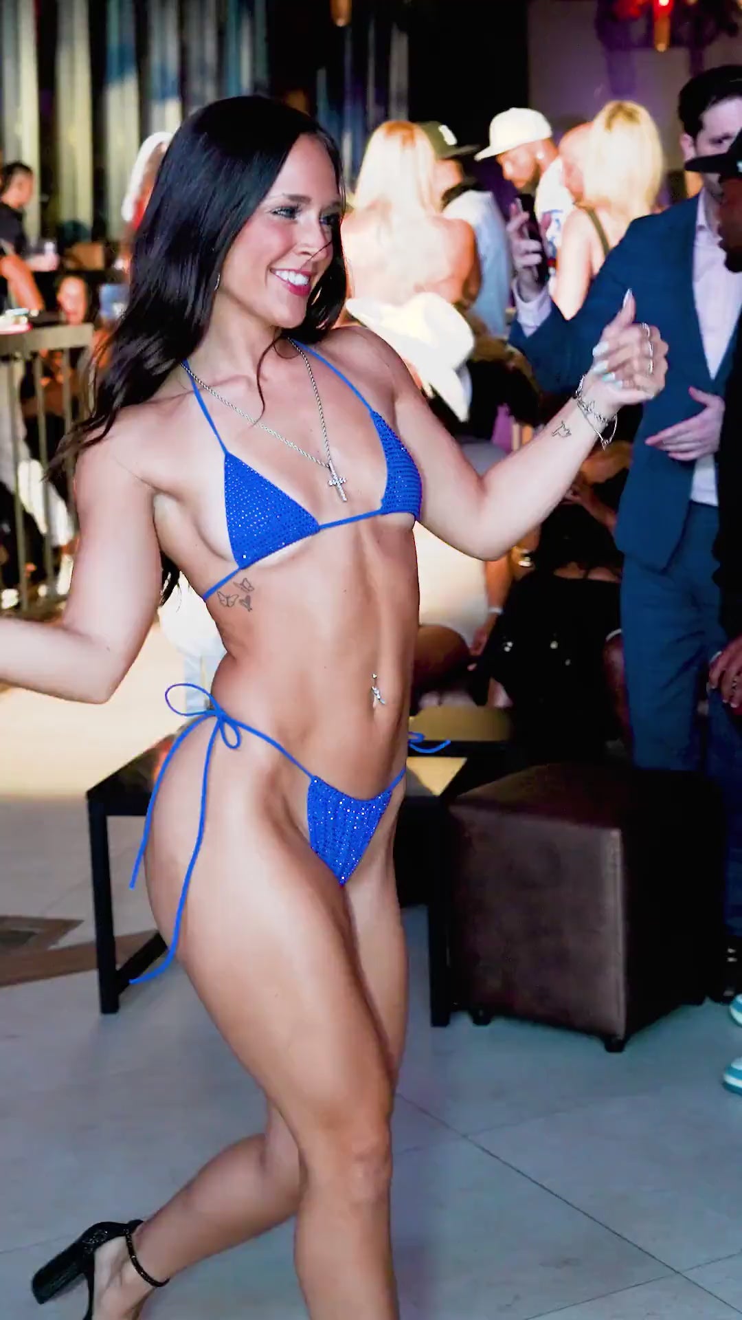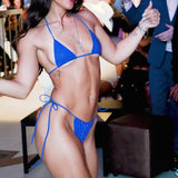 The bikini features a classic triangle top and a sleek drawstring rope bottom, each meticulously embellished with mineral blue rhinestones for a continuous shimmer. Bottoms can run a bit larger, watch the models to know exactly how it fits.