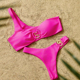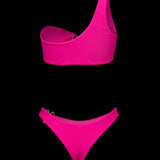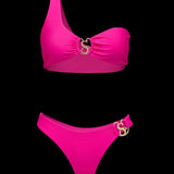 With its striking single shoulder silhouette and sleek form-fitting bottoms, you will be radiating your inner queen.